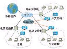 目前,大多數(shù)大型企業(yè)與分支機(jī)構(gòu)的電話和計(jì)算機(jī)網(wǎng)絡(luò)是相互獨(dú)立的,分處各地的辦公機(jī)構(gòu)建有局域網(wǎng),局域網(wǎng)之間通過Internet或企業(yè)專網(wǎng)互連,企業(yè)的數(shù)據(jù)業(yè)務(wù)通過計(jì)算機(jī)網(wǎng)絡(luò)傳輸。而各辦公機(jī)構(gòu)的電話網(wǎng)則采用傳統(tǒng)的電話交換機(jī)或集團(tuán)電話,內(nèi)部員工之間相互是分機(jī)撥號(hào),電話交換機(jī)接入電信電話公網(wǎng),與外部的語(yǔ)音交流需要通過本地電話網(wǎng)或長(zhǎng)途電話網(wǎng)。