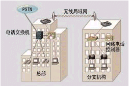 如圖2所示,兩個(gè)辦公樓之間距離較遠(yuǎn),不方便布線,其計(jì)算機(jī)網(wǎng)絡(luò)可以通過無線局域網(wǎng)來連接。在總部已有電話交換機(jī)系統(tǒng),這時(shí)只需在分支機(jī)構(gòu)中增加Cisco網(wǎng)絡(luò)電話控制器,布署IP電話機(jī),然后通過總部帶語(yǔ)音模塊的Cisco路由器或交換機(jī),接入總部的電話交換機(jī),分支機(jī)構(gòu)就可以享用總部的電話中繼線路,與總部一樣自由地使用電話系統(tǒng)。