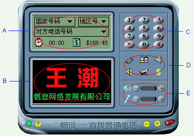 (如圖1)“王潮暢談?wù)Z音全球通”的主界面。A部分是虛擬液晶顯示屏,這里顯示的內(nèi)容與 D(功能鍵區(qū))相對(duì)應(yīng),B是廣告位,如果有興趣可以與王潮公司聯(lián)系作廣告(^_^),C是撥號(hào)區(qū),D是功能按鈕區(qū),集中了這個(gè)軟件的主要功能,E是音量調(diào)節(jié)區(qū)。整個(gè)界面簡(jiǎn)潔合理。