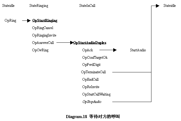 當用戶進入Idle狀態(tài)以后,如果系統(tǒng)接收到一個INVITE消息,系統(tǒng)將進入Ring狀態(tài),并且進入Opring操作中,這個時候硬件設備將播放振鈴聲,這個時候如果用戶決定摘機通話,那么offhook事件就會產(chǎn)生,同時OpAnswerCall將使狀態(tài)機進入InCall狀態(tài),向主叫發(fā)送200響應消息,同樣RTP/RTCP通道打開,開始通話,如果通話完畢,雙方掛機,那么互相發(fā)送SIP