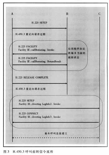 ·呼叫前轉(zhuǎn)。該業(yè)務(wù)包括無條件呼叫前轉(zhuǎn)、遇忙呼叫前轉(zhuǎn)、無應(yīng)答呼叫前轉(zhuǎn)、呼叫轉(zhuǎn)向(Call Deflection)等。它應(yīng)用于呼叫建立階段,將一個(gè)到本終端的來話轉(zhuǎn)向到其它的目的地址,此地址可采用多種形式的別名地址(如電話號(hào)碼、IP地址、E-mail地址等)指定。