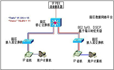 目前各個廠商的系列IP話機均提供2個以太網端口,一個連接網絡交換機,一個可以連接用戶PC,與網絡交換機連接端口支持802.1Q/p,可以實現IP語音和用戶PC劃歸不同的VLAN,而且IP語音包會帶上第二層和第三層的優(yōu)先級標記,可以和客戶具有QoS支持的數據網絡平臺結合,提高IP話音質量。