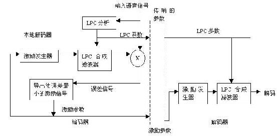 為了說明問題,考慮人的聲道產(chǎn)生的一個語音模式:當人說話產(chǎn)生語音信號時就會發(fā)出濁音(如音素pa、da等)和清音(如音素sh、th)。激勵信號就是由輸入的語音信號導(dǎo)出的,其方法是使合成語音與輸入語音的差別非常小。LPC的用法、激勵的產(chǎn)生以及對合成分析(AbS)系統(tǒng)的誤差檢查均如圖4-1所示。