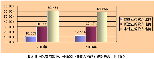 從圖2可知,固網(wǎng)運(yùn)營(yíng)商數(shù)據(jù)業(yè)務(wù)收入2003年和2004年僅占總收入的10.65%和12.5%,數(shù)據(jù)業(yè)務(wù)年增幅達(dá)34.2%,數(shù)據(jù)業(yè)務(wù)收入增加值為89.87億元;同期,因IP電話(huà)分流造成的長(zhǎng)途業(yè)務(wù)減收為146.06億元,可見(jiàn)在2004年數(shù)據(jù)業(yè)務(wù)的增長(zhǎng)彌補(bǔ)不了IP電話(huà)分流造成的長(zhǎng)途業(yè)務(wù)收入的流失。