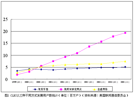 從經(jīng)營(yíng)模式上看,本地非主導(dǎo)運(yùn)營(yíng)商的商業(yè)模式在過去的5年中發(fā)生了很大變化。在市場(chǎng)剛剛開始引入競(jìng)爭(zhēng)的1999年,42.9%的本地非主導(dǎo)運(yùn)營(yíng)商選擇了批發(fā)零售這種進(jìn)入門檻相對(duì)較低的商業(yè)模式,本地電話市場(chǎng)一度活躍著大量地區(qū)性的小運(yùn)營(yíng)商。由于面臨本地主導(dǎo)運(yùn)營(yíng)商的強(qiáng)烈抵制,非綁定網(wǎng)元政策的實(shí)施自公布以來一再推遲,經(jīng)過反復(fù)的法律訴訟,美國最高法院在2002年最終裁定非綁定網(wǎng)元政策合法。自那時(shí)起,AT&T、MCI等全國性的長(zhǎng)途電話運(yùn)營(yíng)商紛紛通過租用非綁定網(wǎng)元的方式進(jìn)入本地電話市場(chǎng)。截止到2004年6月,本地主導(dǎo)運(yùn)營(yíng)商已經(jīng)提供了約2150萬線非綁定本地用戶線給本地非主導(dǎo)運(yùn)營(yíng)商。CLEC以三種方式發(fā)展用戶的情況如圖2所示。