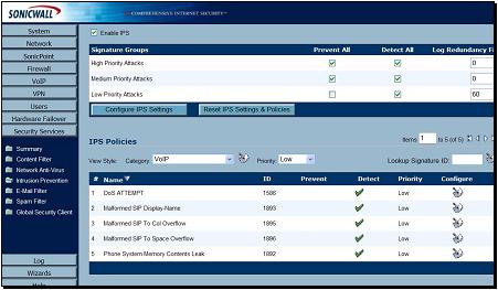 SonicWALL入侵檢測服務(wù)(IPS)能夠?yàn)閂oIP協(xié)議應(yīng)用層提供全面保護(hù)。IPS集成了一個(gè)可配置的超高性能掃描引擎,配合動態(tài)更新和擁有1900多攻擊和漏洞簽名的數(shù)據(jù)庫,可以保護(hù)網(wǎng)絡(luò)免受最復(fù)雜的木馬和變形威脅的影響。SonicWALL已經(jīng)利用一系列VoIP相關(guān)的簽名來擴(kuò)展其IPS簽名數(shù)據(jù)包,可以防止惡意業(yè)務(wù)流到達(dá)受保護(hù)的VoIP電話和服務(wù)器。