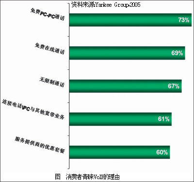市場(chǎng)調(diào)研咨詢(xún)公司Yankee Group日前針對(duì)消費(fèi)者進(jìn)行了一次調(diào)查,結(jié)果顯示:73%的用戶(hù)喜歡VoIP是因?yàn)橥ㄟ^(guò)它可以進(jìn)行免費(fèi)的PC對(duì)PC通話(huà);69%的用戶(hù)喜歡VoIP在線呼叫的功能;67%的用戶(hù)表示,VoIP廉價(jià)的通話(huà)費(fèi)用使人們可以無(wú)限制地通話(huà),令人心動(dòng);61%的用戶(hù)表示,喜歡通過(guò)VoIP使電話(huà)與PC、其他在寬帶網(wǎng)絡(luò)上的一些活動(dòng)捆綁起來(lái);60%的用戶(hù)表示被服務(wù)提供商提供的優(yōu)惠套餐吸引。對(duì)于用戶(hù)來(lái)說(shuō),VoIP最大的吸引力似乎在于其低廉的話(huà)費(fèi)和為人們帶來(lái)的方便。