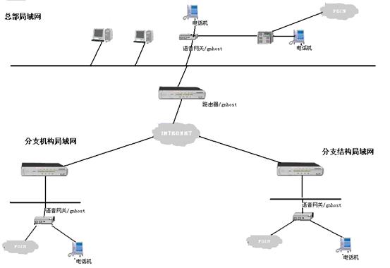 首先將VOIP電話網關的網絡接口接入到公司和分部(分公司)的局域網中,通過ADSL、ISDN、撥號上網等方式,同連接在此因特網上的其它VOIP電話網關相連,從而將不同地域的電話連接在一起,組成整個公司的IP電話網,如果總部或分部有用戶程控交換機,還可以將VOIP電話網關接入程控交換機,使得整個交換機的分機都能利用IP網絡撥打免費電話。如果這個VOIP設備具有PBX的功能。那么電話網關的多種接口還可以與電信(PSTN)相連,從而將專網的IP電話語音網與整個公網銜接成一個大的電話網絡。