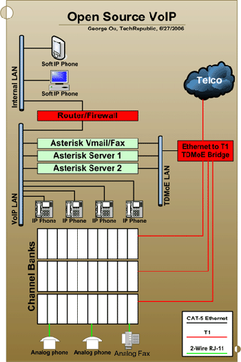 TDMoE(基于以太網(wǎng)的時分復(fù)用)LAN段負(fù)責(zé)PBX-語音郵箱和PBX-信道處理單元的通信。在過去,這些設(shè)備間的TDM通信使用昂貴的T1卡,但是通過將TDM通信搬到廉價的以太網(wǎng)上,這一點(diǎn)已經(jīng)得到極大的改善。