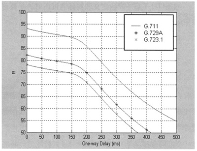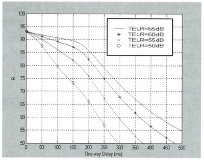 Datagram Protocol)協(xié)議進行傳輸[1]。近年來,隨著IP網(wǎng)絡技術的廣泛應用,VoIP成為一種新興的電話通信方式,IP網(wǎng)絡所提供的語音質(zhì)量問題受到人們的普遍關注,如何對語音質(zhì)量進行科學可靠的測量和評價是網(wǎng)絡測量和網(wǎng)絡規(guī)劃設計中十分關鍵的問題。E-Model作為語音質(zhì)量測量的一種新方法,它適合數(shù)據(jù)網(wǎng)絡的語音質(zhì)量測量,必將有廣泛的應用。本文將在E模型下分析延時、噪聲、回音和語音壓縮等對VoIP語音質(zhì)量的影響。