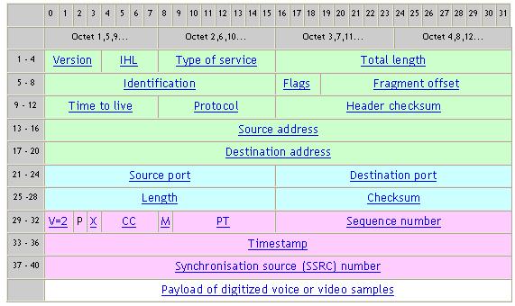 根據(jù)IETF的標準建議,通過IP網(wǎng)絡(luò)傳輸語音信號樣本需要增加三個額外的報頭,每個報頭對應(yīng)一個網(wǎng)絡(luò)層次,即IP,UDP和RTP [4]。