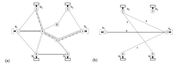 網(wǎng)絡(luò)拓撲如圖3(a)所示,以鏈路A-C為例,將通過鏈路A-C的端到端的呼叫分別表示為a, b, c, d,如圖3(b)所示, (i =