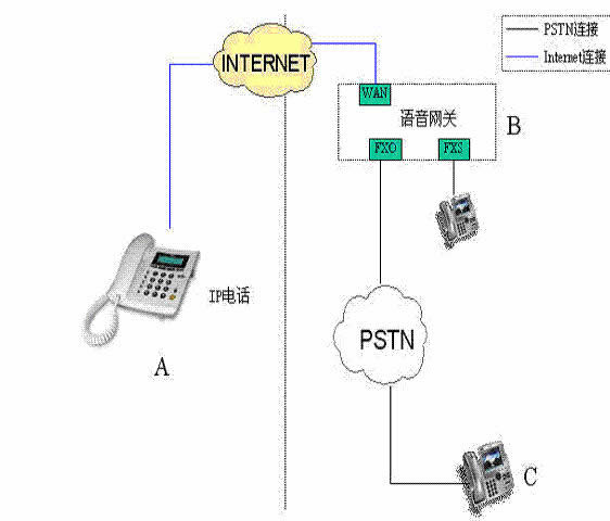 反之如果B點(diǎn)的當(dāng)?shù)仉娫?huà)用戶(hù)C,透過(guò)電話(huà)撥接到B點(diǎn)的FXO口,然后利用INTERNET網(wǎng)絡(luò)轉(zhuǎn)接回A點(diǎn),這就是上車(chē)。