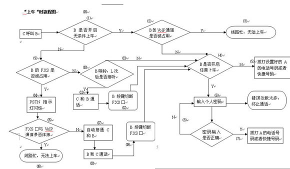 - 若C是為了上車(chē),則B端接聽(tīng)方按鍵“*#*”切斷FXS通路,進(jìn)入⑷--⑻