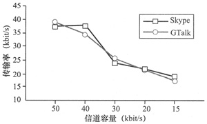 kbit/s時,GTalk發(fā)生了很明顯的變化,傳輸速率降低到了35 kbit/s。這個變化使得其PESQ MOS分數(shù)與Skype相比有所提高,而Skype的傳輸速率則接近信道容量。當(dāng)信道容量變?yōu)?0
