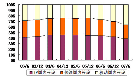 從圖中可以看出,IP電話的相對快速增長在一定程度上對傳統(tǒng)長途電話形成了替代作用,但近年來自于移動(dòng)長途的替代作用更明顯。從占比上來看,2007年上半年,IP國內(nèi)長途電話占全部國內(nèi)長途通話量38.3%,超過移動(dòng)長途電話的35.9%和傳統(tǒng)長途電話的25.8%,仍然是長途電話的主流。