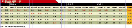 從綜合評(píng)分情況來看,思科、Avaya以明顯的優(yōu)勢位列IP語音產(chǎn)品的第一集團(tuán),他們的優(yōu)勢非常明顯,幾乎在所有指標(biāo)上都位居前列,而包括北電、阿爾卡特朗訊和H3C在內(nèi)的品牌位列第二集團(tuán)。