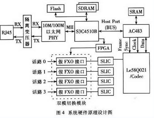 本節(jié)提出了一種基于H.323的雙模網(wǎng)關(guān)的系統(tǒng)設(shè)計(jì)方案,該方案支持4路話音,使用一種經(jīng)濟(jì)實(shí)用的“假FXO接口”方式實(shí)現(xiàn)雙模切換,能夠在VoIP通話時(shí)檢測到PSTN線上進(jìn)來的呼叫并可通過按話機(jī)的拍簧或者Flash閃斷鍵切換接聽。