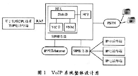 通過對國內(nèi)外VoIP技術(shù)的研究,要面向社會推廣價格低廉的IP電話業(yè)務,普通用戶的電話終端成本,運營商的設(shè)備、管理成本都是必須考慮的因素。因此,設(shè)計出了一個VoIP系統(tǒng)方案,如圖1所示。