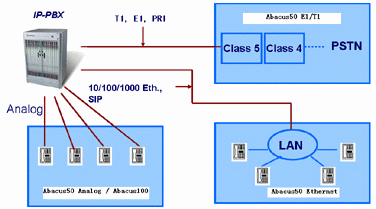 根據(jù)對于企業(yè)級IP-PBX進行孤立節(jié)點測試的需求,Abacus50-Ethernet可以仿真VoIP網(wǎng)絡(luò)(包括軟交換,網(wǎng)關(guān),VoIP電話等單個節(jié)點或節(jié)點群),接入企業(yè)級IP-PBX的Ethernet接口;Abacus50-Analog可以仿真模擬電話機接入企業(yè)級IP-PBX的FXS模擬接口;Abacus50E1/T1還可以仿真PSTN網(wǎng)絡(luò)(交換網(wǎng)絡(luò)和接入網(wǎng)絡(luò)),接入企業(yè)級IP-PBX的E1/T1接口。因此,Abacus系統(tǒng)仿真了企業(yè)級IP-PBX周圍的網(wǎng)絡(luò)節(jié)點,將其“孤立”起來,便可輕松實現(xiàn)模擬話機到VoIP網(wǎng)絡(luò),模擬話機到PSTN網(wǎng)絡(luò),IP話機到VoIP網(wǎng)絡(luò)的性能測試;檢驗企業(yè)級IP-PBX的呼叫能力和穩(wěn)定性、語音編解碼的處理能力、語音質(zhì)量以及延遲等性能指標。當(dāng)然,如果再利用思博倫的數(shù)據(jù)測試儀表(例如Smartbits)仿真PC同時發(fā)送IP數(shù)據(jù)流通過IP-PBX,還可以通過測試得到數(shù)據(jù)流量對話音質(zhì)量的影響,檢驗出IP-PBX對于多種媒體流共存情況下QoS分級處理的能力。