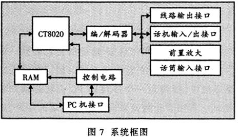 ——硬件平臺(tái)構(gòu)造于PC機(jī)上,采用ISA總線插卡方式,如圖7所示。該平臺(tái)采用了美國DSPG公司的專用數(shù)字信號(hào)處理器CT8020作為核心部件,利用先進(jìn)的可編程邏輯器件開發(fā)了外圍控制電路和接口電路。它主要完成以下功能。