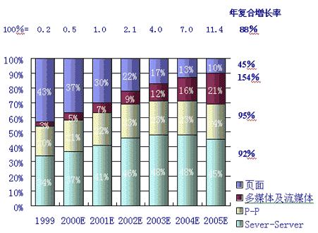 同時(shí),人們對(duì)P-P的互動(dòng)及多媒體的傳輸?shù)男枨髮⒊蔀榫W(wǎng)絡(luò)使用的2個(gè)最主要的發(fā)展趨勢(shì)。據(jù)麥肯錫公司和JP摩根的分析和預(yù)測(cè),多媒體及流媒體的IP流量將以每年154%的復(fù)合率增長(zhǎng),而P-P的IP流量將以95%的年復(fù)合增長(zhǎng)率增長(zhǎng),這2項(xiàng)將成為用戶(hù)需求增長(zhǎng)最快的業(yè)務(wù)。如下圖,