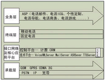 企業(yè)利用語(yǔ)音門(mén)戶(hù),可以通過(guò)節(jié)省人工座席成本實(shí)現(xiàn)低成本地發(fā)布信息,提供客戶(hù)服務(wù),而且可以實(shí)現(xiàn)其它有價(jià)值的業(yè)務(wù),開(kāi)創(chuàng)新的市場(chǎng)空間和利潤(rùn),其業(yè)務(wù)系統(tǒng)層次如圖2所示。