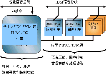 圖5畫(huà)出了這種技術(shù)實(shí)現(xiàn)的VoP系統(tǒng)框圖。圖中專(zhuān)用ASIC/FPGA引擎提供打包、匯聚、壓縮和回聲抑制功能。而DSP則用于信令功能,如音頻信號(hào)的接收和生成,DSP還用于開(kāi)發(fā)商自定義功能。