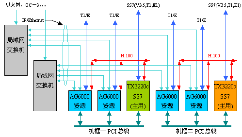 結(jié)構(gòu)圖中表示有兩臺機器,每臺機器都插有兩塊AG6000資源卡和一塊TX3220c卡。一臺機器是主用的,而另一臺是冗余備份的。AG6000完成媒體網(wǎng)關(guān)的功能,TX3220c完成信令網(wǎng)關(guān)的功能,媒體網(wǎng)關(guān)控制器是軟件實現(xiàn)的,沒有對應(yīng)的硬件。
