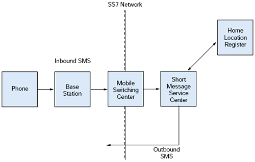 從MSC, SMS消息在SS7網(wǎng)絡(luò)中發(fā)送到短消息中心(SMSC), 一個網(wǎng)絡(luò)的標(biāo)準部分. SMSC向Home Location