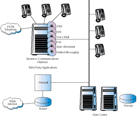 一個(gè)簡(jiǎn)單的更有效的方法去配置和管理企業(yè)的通信系統(tǒng)是用一個(gè)基于商務(wù)通信平臺(tái)概念的融合系統(tǒng),來(lái)取代已經(jīng)過(guò)時(shí)了的PBX/KTS和它的附屬媒體服務(wù)器。這樣一個(gè)系統(tǒng)的基本結(jié)構(gòu)如圖2所示。 商務(wù)通信平臺(tái)處于企業(yè)通信系統(tǒng)的心臟位置,是一個(gè)開放的、基于標(biāo)準(zhǔn)的、為傳統(tǒng)的和下一代語(yǔ)音應(yīng)用和服務(wù)建立的平臺(tái)。系統(tǒng)建立在標(biāo)準(zhǔn)計(jì)算機(jī)和計(jì)算機(jī)電話構(gòu)建模塊上,包括網(wǎng)絡(luò)和局站的接口,以及豐富的通信媒體資源。在傳統(tǒng)結(jié)構(gòu)下運(yùn)行于單個(gè)附屬服務(wù)器上的應(yīng)用,現(xiàn)在運(yùn)行于一個(gè)邏輯結(jié)構(gòu)之上,在該結(jié)構(gòu)中,單個(gè)或多個(gè)物理服務(wù)器連接到企業(yè)網(wǎng)絡(luò)上。 商務(wù)通信平臺(tái)還具有一個(gè)優(yōu)勢(shì),就是作為電路交換時(shí)分復(fù)用(TDM,time