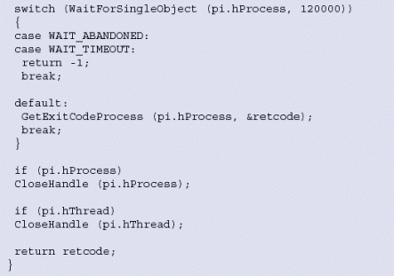 圖7中的函數(shù)RunProgram()顯示了一種產(chǎn)生Windows進(jìn)程,然后等待該進(jìn)程執(zhí)行完成的方式。